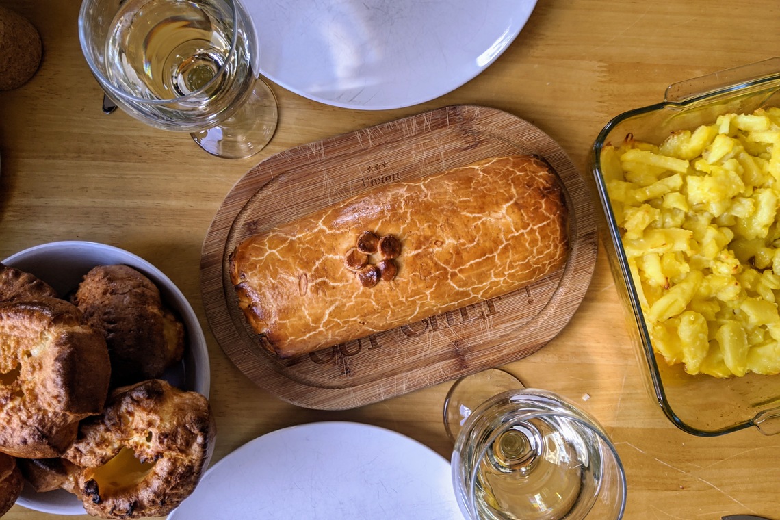 Place the nut roast log on top of the shortcrust pastry, and wrap the pastry around the loaf.