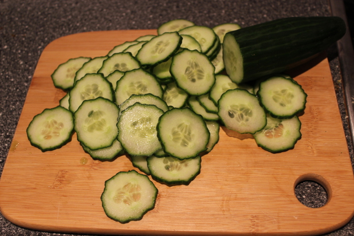 Cut the whole cucumber in thin slices, around 1 millimetre thick.